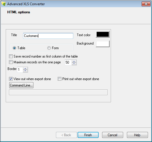 "c:\Program Files\Advanced XLS Converter\xlscnv.exe" file.xlsx outfile.htm [/FILTER | /COLUMNS | /SORTBY | /SHEETNUM] [/TITLE | /MAXPERPAGE | /ASFORM | /COLOR | /BACKGROUND]